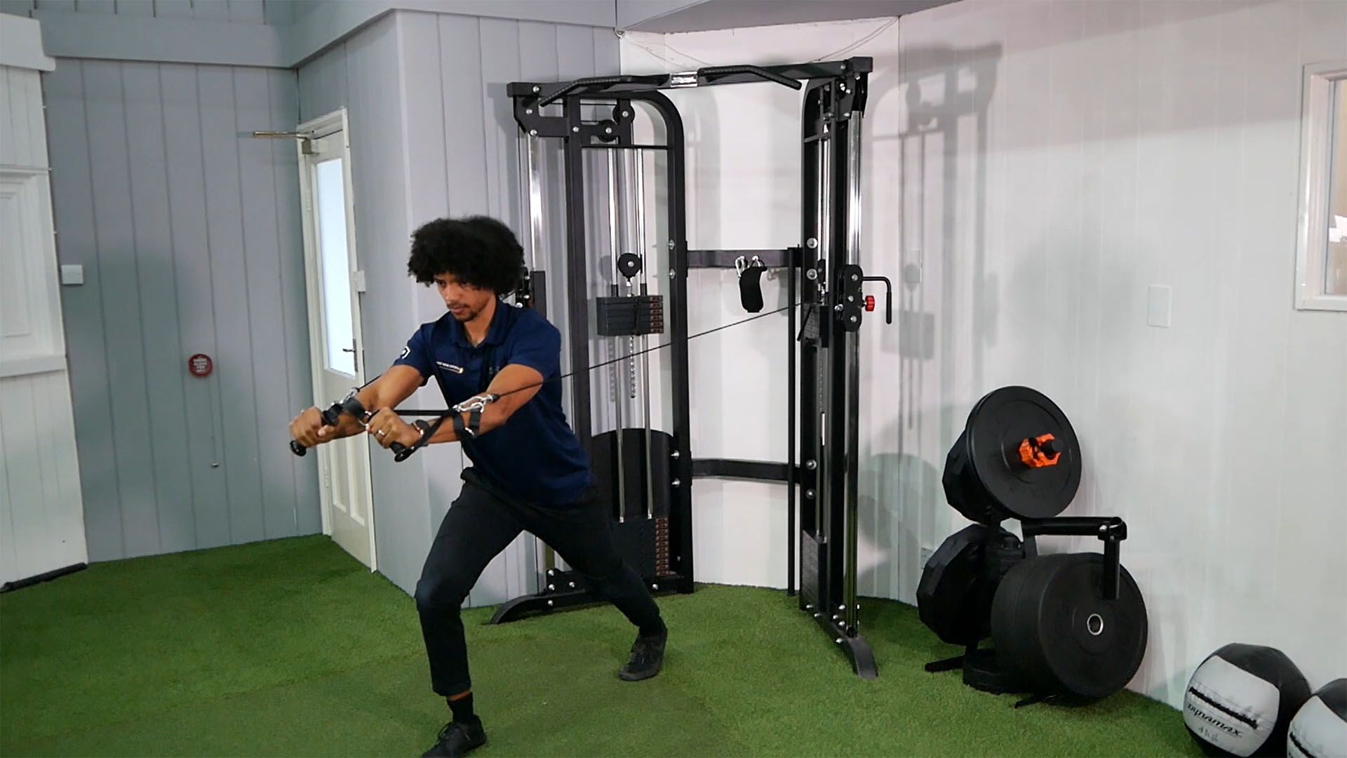 Gym access with dumbbells, cables, and steps